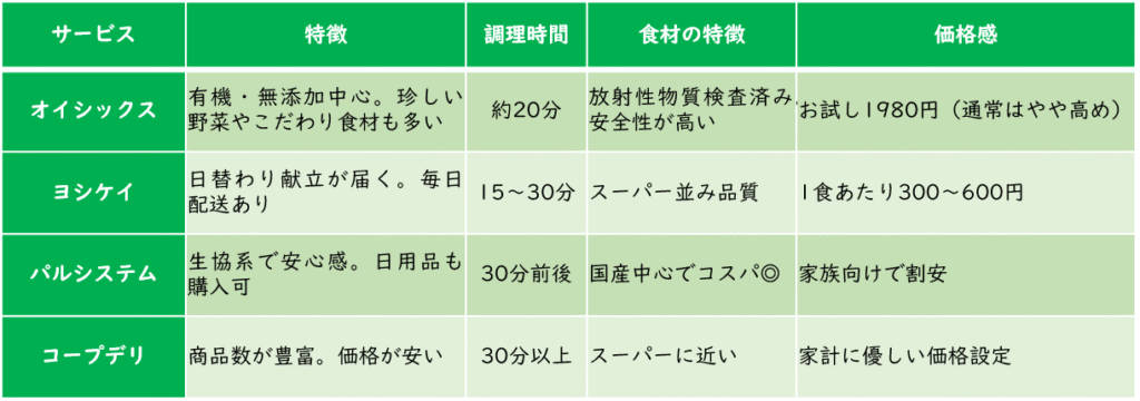 食材宅配サービスはオイシックスだけでなく、ヨシケイ・パルシステム・コープデリなど多くの選択肢があります。その中で、オイシックスのお試しセット1980円が注目される理由は「品質と利便性の両立」です。