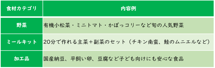 • ベビー&キッズプラン:妊娠期や授乳期、離乳食に合わせた食材が届く。子育て世代に人気。