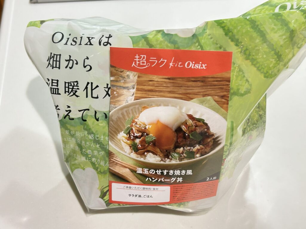 今回のメニューは「温玉のせすき焼き風ハンバーグ丼」で、下ごしらえ済みのハンバーグや野菜、調味料がすべてセットになっており、レンジとフライパンであっという間に仕上がります。副菜のサラダもセットになっていて、栄養バランスも◎。